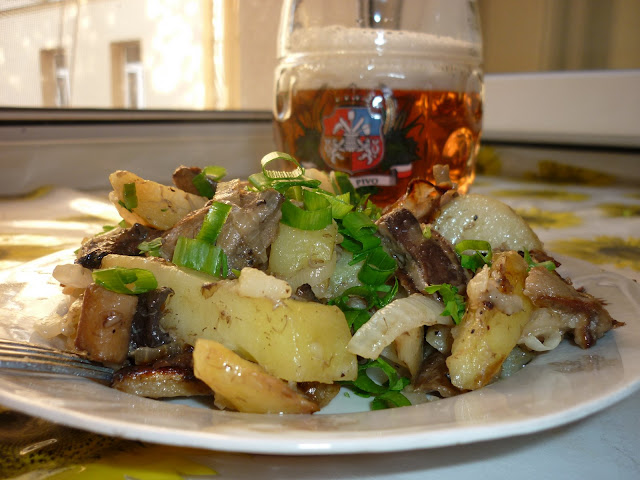Тут у нас после поездки на Селигер остались грибыРешили приготовить банальный жареный картофель с грибами.Для начала грибы(ассорти белые,подберёзовики,сыроежки,лисички) перебирались тщательно мною ,затем хорошо перемывались(мыли под струёй воды моя жена и жена Тома,потому как собирали и отдыхали вместе),затем в кастрюлю чуть воды и довести до кипения,воду слить и ещё раз перемыть...,вот собственно в таком состоянии они и были довезены до Москвы.Дальше грибы выкладываем на горячую сковороду(в нашем случае казан) Жарим до полного удаления влаги и характерного пощёлкивания,солим,перчим,чуть лука,и снова жарим Картофель режем крупной соломкой(по объёму примерно 50/50 с грибами) Добавляем ещё лука и жарим до готовности и добавляем зелень | Поблагодарили(1): Natusik |  |